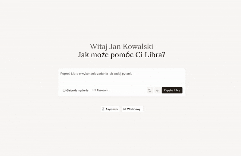 Libra nie jest samodzielną bazą wiedzy. To środowisko pracy oparte na AI, które łączy się z LEX i pozwala płynnie przechodzić od pytania, przez źródło, do projektu dokumentu i analizy — w jednym, ciągłym procesie pracy wspieranym przez generatywną AI.